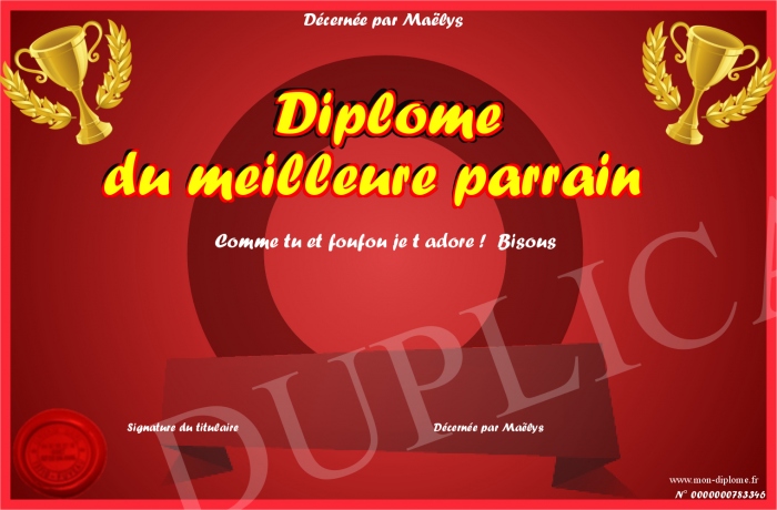 Envoyez par email votre Diplôme du meilleure parrain personalisé