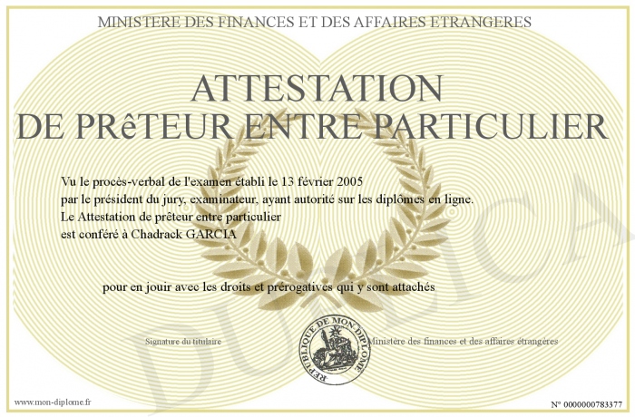 Envoyez par email votre Attestation de prêteur entre particulier personalisé