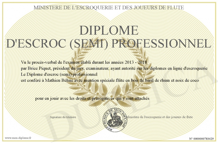 Envoyez par email votre Diplôme d'escroc (semi) professionnel personalisé
