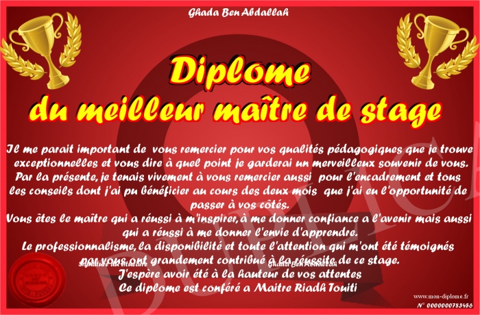 Envoyez par email votre Diplôme du meilleur maître de stage personalisé