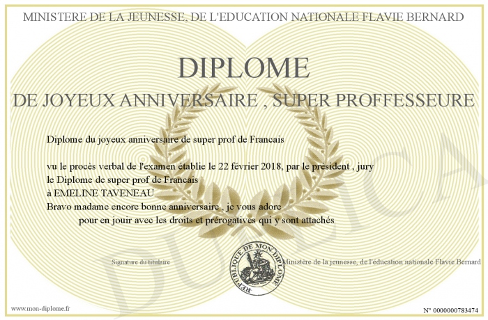 Envoyez par email votre Diplôme de joyeux anniversaire , super proffesseure personalisé