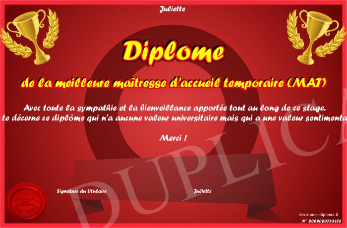 Envoyez par email votre Diplôme de la meilleure maîtresse d'accueil temporaire (MAT) personalisé