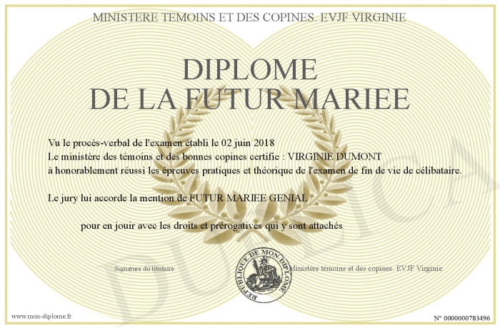 Envoyez par email votre Diplôme de la futur mariée personalisé