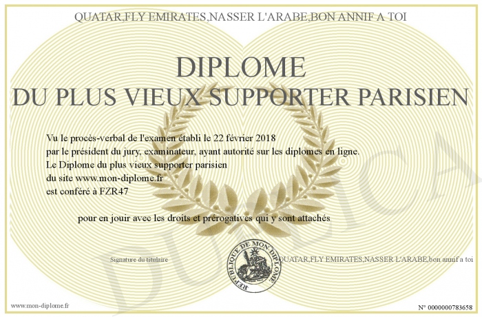 Envoyez par email votre Diplôme du plus vieux supporter parisien personalisé