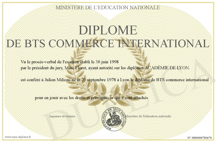 Envoyez par email votre Diplôme de BTS Commerce International personalisé