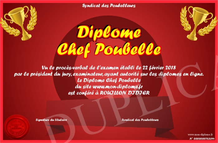 Envoyez par email votre Diplôme Chef Poubelle personalisé