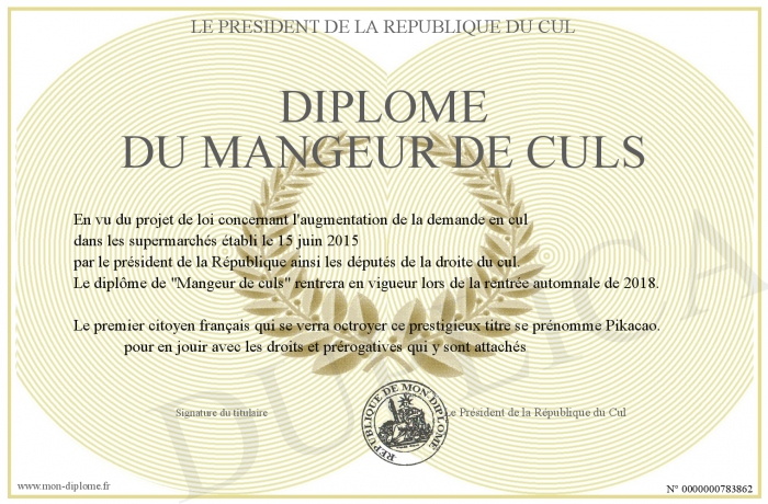 Envoyez par email votre Diplôme du Mangeur de culs personalisé