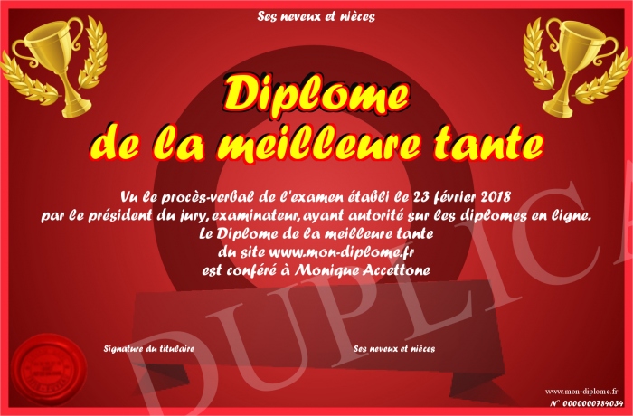 Envoyez par email votre Diplôme de la meilleure tante personalisé