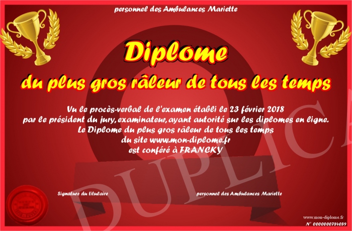 Envoyez par email votre Diplôme du plus gros râleur de tous les temps personalisé