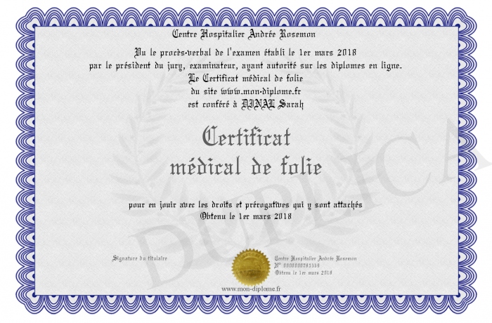 Envoyez par email votre Certificat médical de folie personalisé