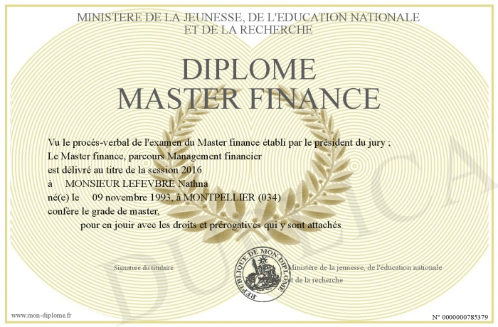 Envoyez par email votre Diplôme MASTER FINANCE personalisé