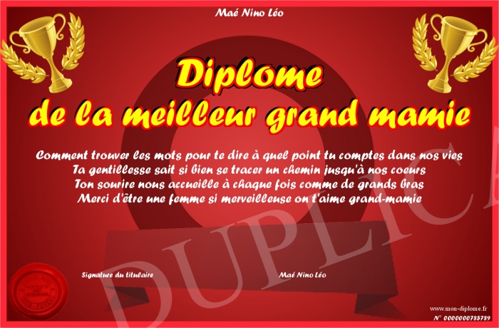Envoyez par email votre Diplôme de la meilleur grand mamie personalisé