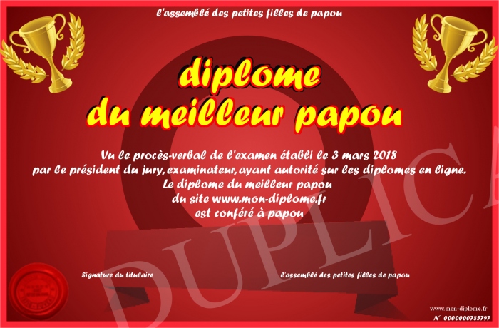 Envoyez par email votre diplome du meilleur papou personalisé