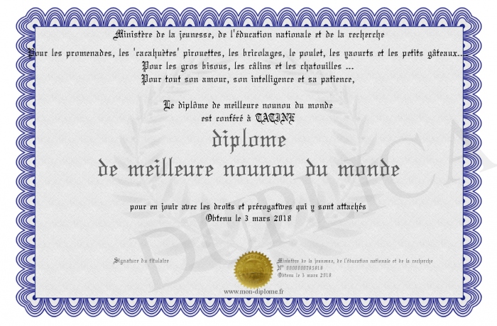 Envoyez par email votre diplôme de meilleure nounou du monde personalisé