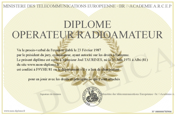 Envoyez par email votre Diplôme Opérateur Radioamateur personalisé