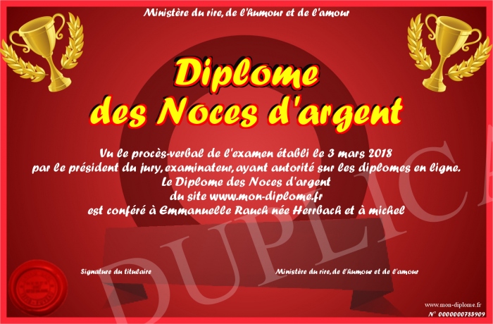 Envoyez par email votre Diplome des Noces d'argent personalisé