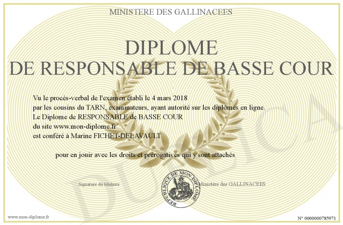 Envoyez par email votre Diplôme de RESPONSABLE de BASSE COUR personalisé