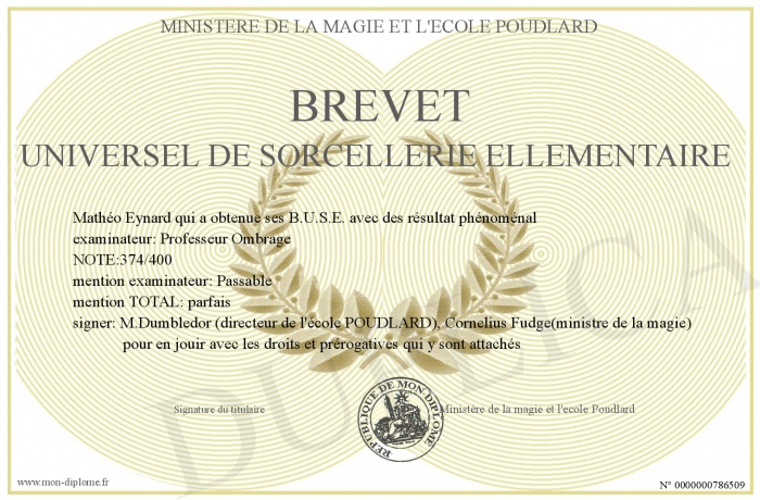Envoyez par email votre Brevet Universel de Sorcellerie Ellementaire personalisé