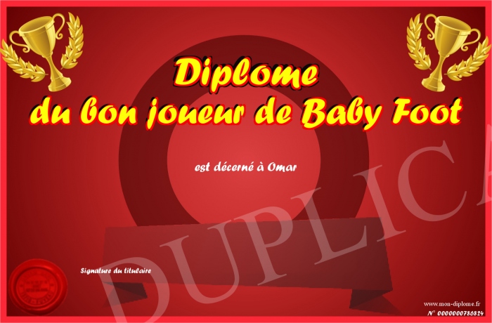 Envoyez par email votre Diplôme du bon joueur de Baby Foot personalisé