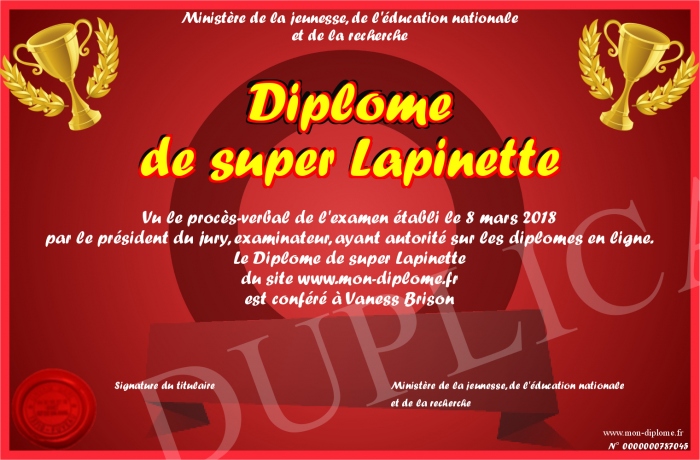 Envoyez par email votre Diplôme de super Lapinette personalisé