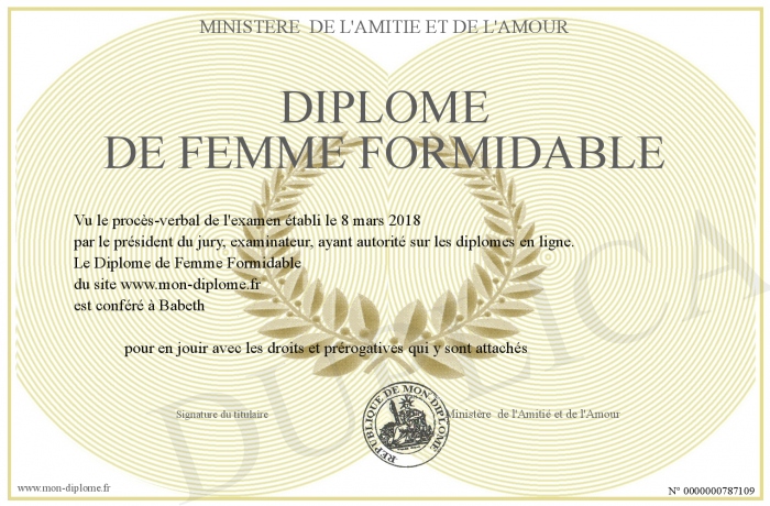 Envoyez par email votre Diplôme de Femme Formidable personalisé