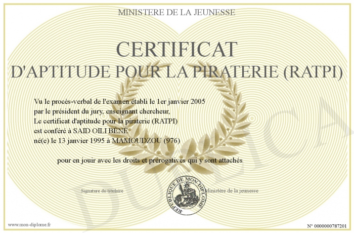 Envoyez par email votre certificat d'aptitude pour la piraterie (RATPI) personalisé