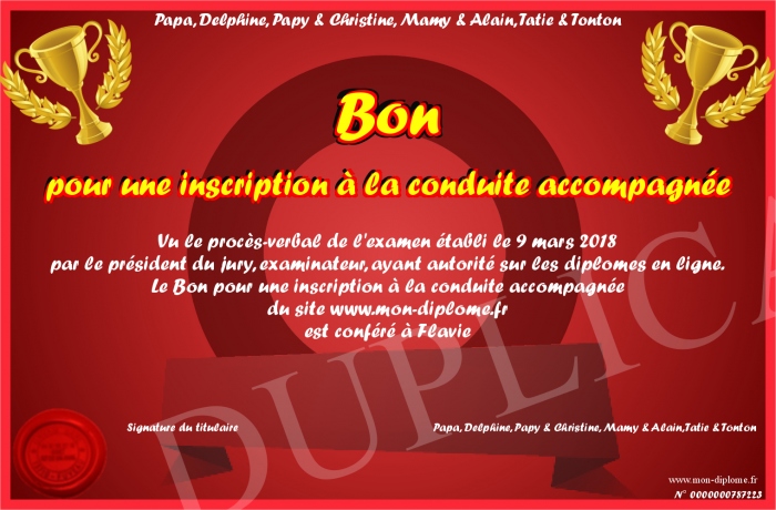 Envoyez par email votre Bon pour une inscription à la conduite accompagnée personalisé