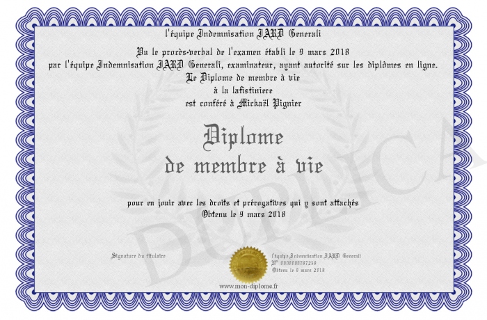 Envoyez par email votre Diplôme de membre à vie personalisé