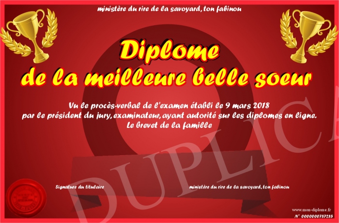 Envoyez par email votre Diplome de la meilleure belle soeur personalisé