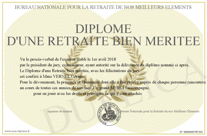 Envoyez par email votre Diplôme d'une Retraite bien méritée personalisé