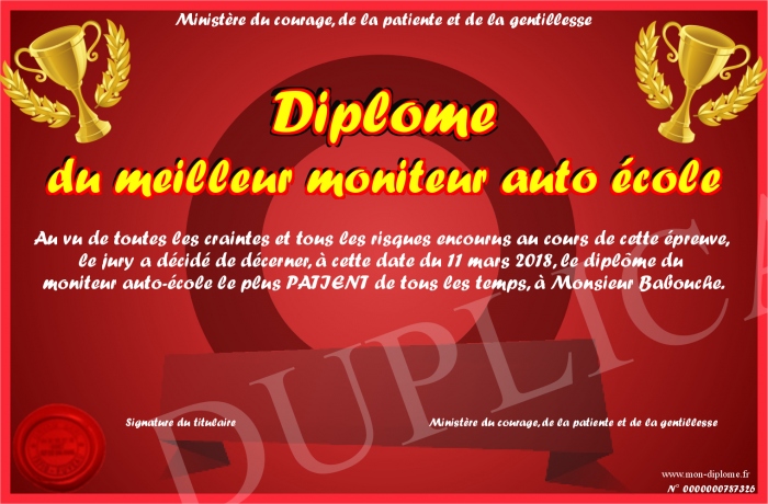 Envoyez par email votre Diplôme du meilleur moniteur auto école personalisé