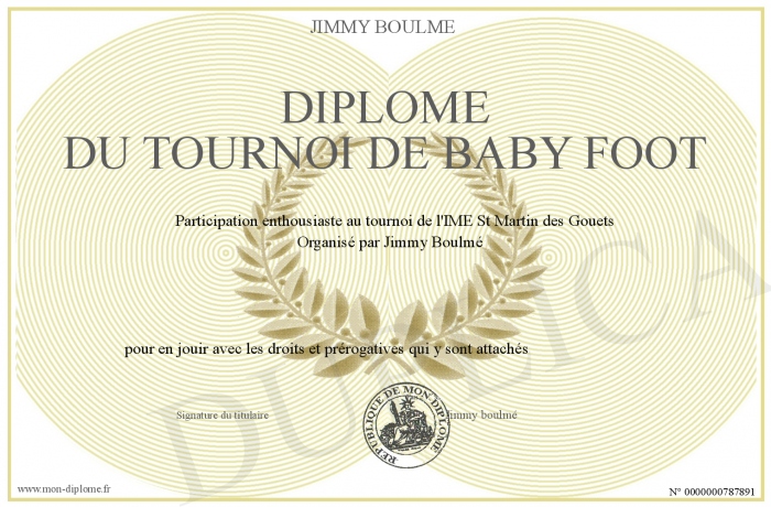 Envoyez par email votre diplôme du tournoi de baby foot personalisé