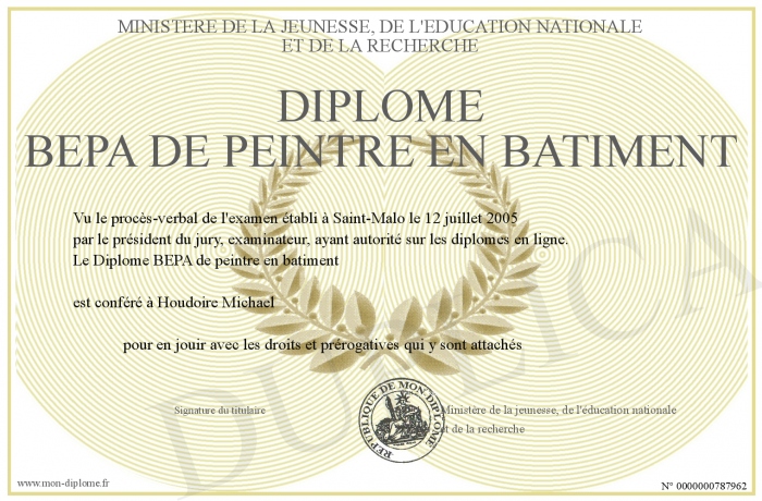 Envoyez par email votre Diplôme BEPA de peintre en batiment personalisé