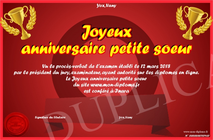 Envoyez par email votre Joyeux anniversaire petite soeur personalisé