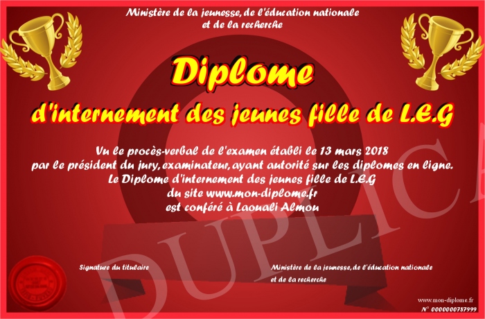 Envoyez par email votre Diplôme d'internement des jeunes fille de L.E.G personalisé