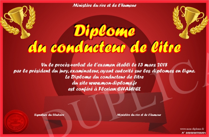 Envoyez par email votre Diplome du conducteur de litre personalisé