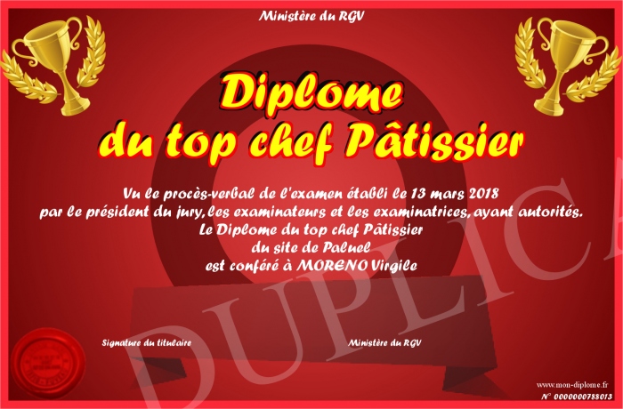Envoyez par email votre Diplôme du top chef Pâtissier personalisé