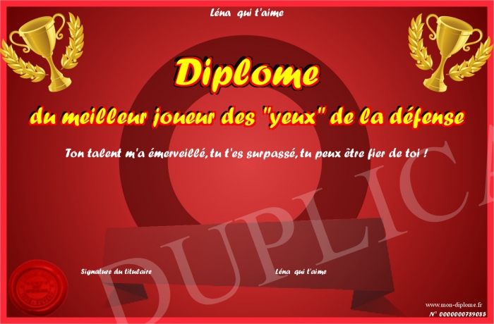 Envoyez par email votre Diplôme du meilleur joueur des -yeux- de la défense personalisé