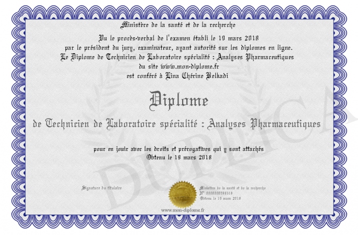 Envoyez par email votre Diplôme de Technicien de Laboratoire spécialité : Analyses Pharmaceutiques personalisé