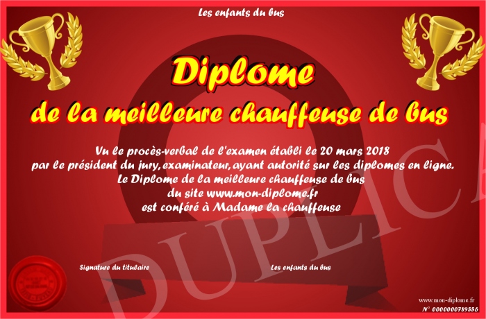 Envoyez par email votre Diplôme de la meilleure chauffeuse de bus personalisé