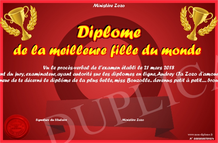Envoyez par email votre Diplôme de la meilleure fille du monde personalisé