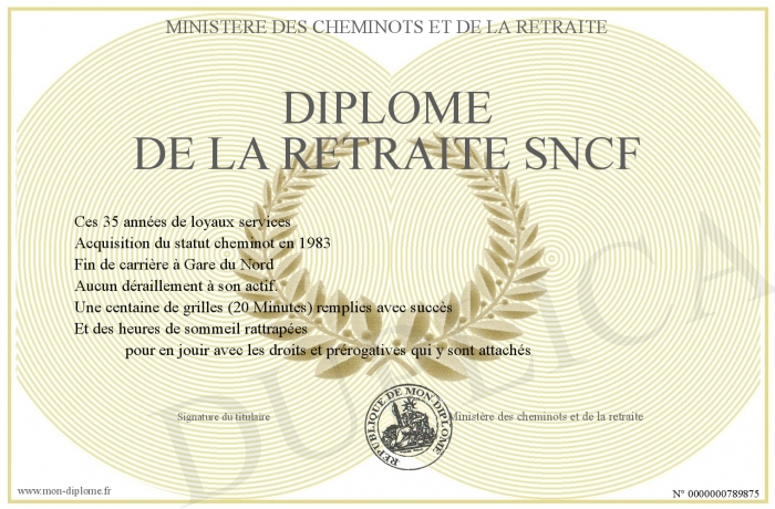 Envoyez par email votre DIPLOME DE LA RETRAITE SNCF personalisé