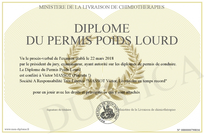 Envoyez par email votre Diplôme du Permis Poids Lourd personalisé
