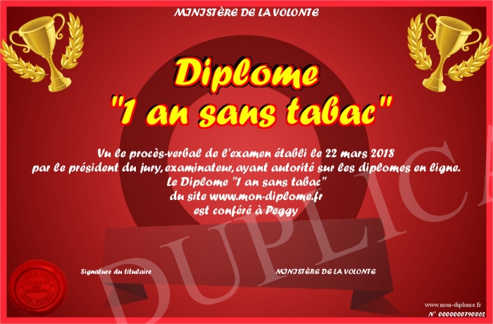 Envoyez par email votre Diplôme -1 an sans tabac- personalisé