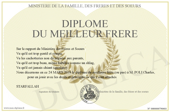 Envoyez par email votre Diplôme du meilleur frère personalisé