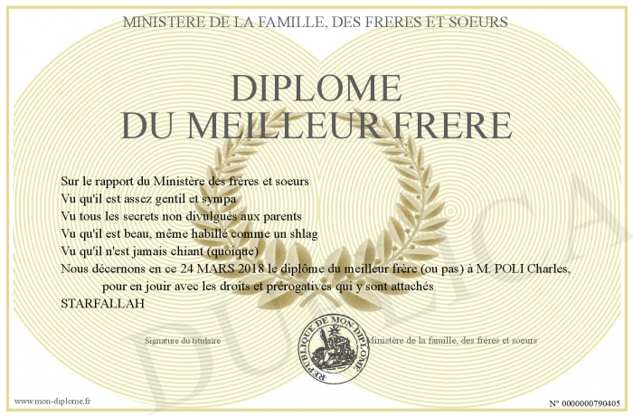 Envoyez par email votre Diplôme du meilleur frère personalisé
