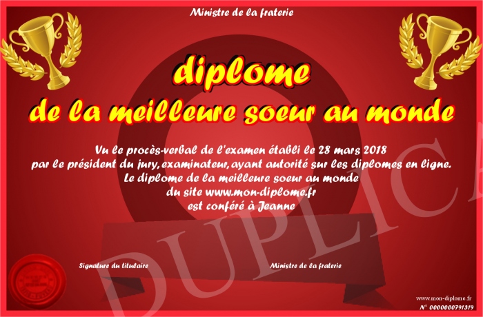 Envoyez par email votre diplome de la meilleure soeur au monde personalisé