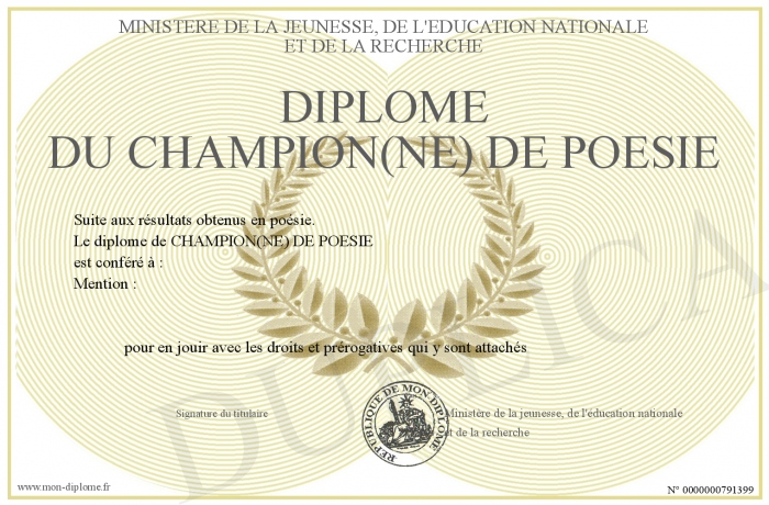 Envoyez par email votre Diplôme du Champion(ne) de poésie personalisé
