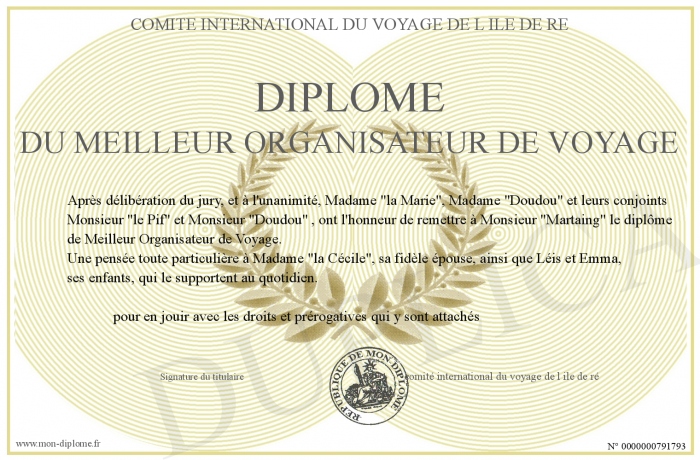 Envoyez par email votre Diplôme du Meilleur organisateur de voyage personalisé