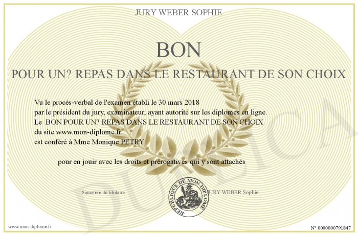 Envoyez par email votre BON POUR UN? REPAS DANS LE RESTAURANT DE SON CHOIX personalisé